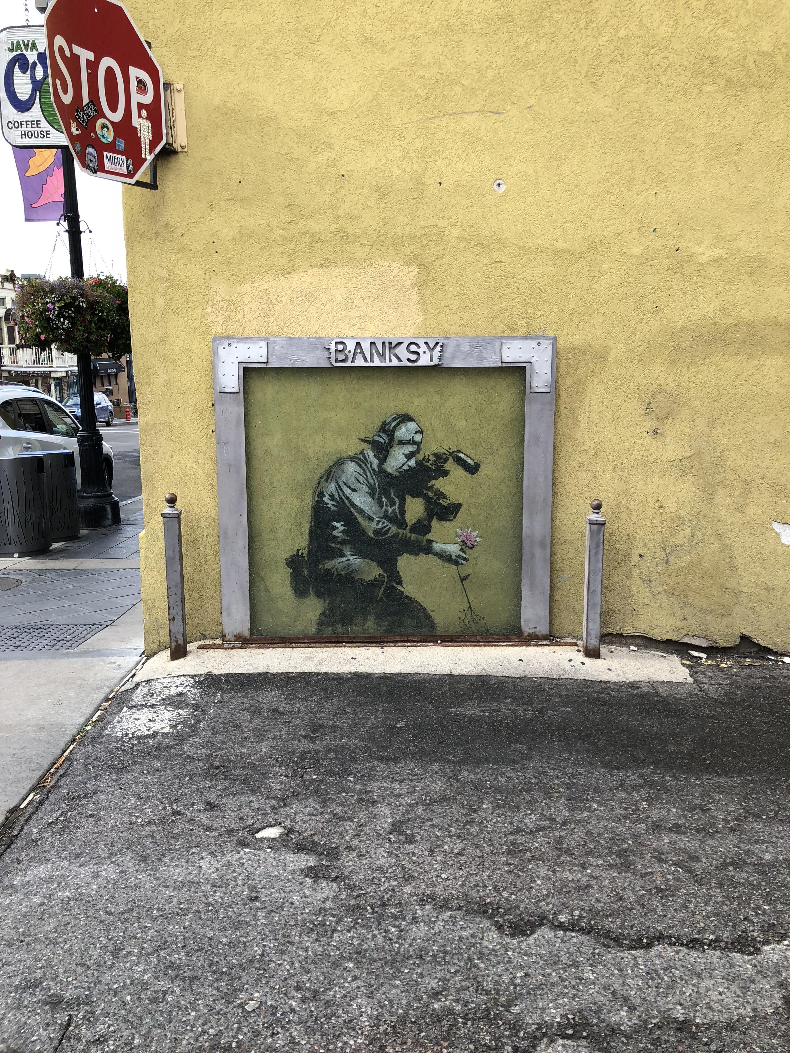 This work of art, and java cow, can be found at 402 main street... Those visitors will notice, adjacent, a chunk of the exterior of the building is deteriorated thinking perhaps that that is part of its charm, however, locals may notice that that area just to the right of the painting has deteriorated over. This work of art, and java cow, can be found at 402 main street. In addition to their functional value, these protective additions have created a seeming shrine to the work of the beloved vandal. He is known for his political, satirical and sometimes humorous street art. Exit through the gift shop... In addition to their functional value, these protective additions have created a seeming shrine to the work of the beloved vandal.